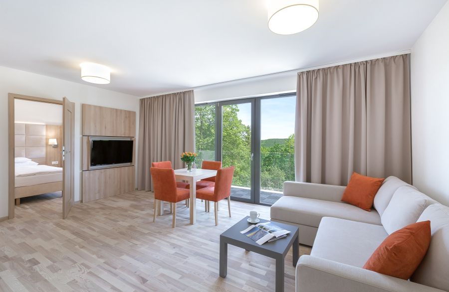 Aparthotel Blue Mountain Resort w swojej ofercie ma 273 apartamentów w 2 kategoriach: 30 typu Suite oraz 243 Deluxe. Łącznie pomieści się tu nawet 1000 gości. Wszystkie apartamenty posiadają wyjście na przeszklony balkon, są dobrze doświetlone, utrzymane w jasnej kolorystyce, z przewagą bieli i szarości. Drewniane panele na ścianach, modułowe, tapicerowane panele nad łóżkami, grube, beżowe zasłony i dywaniki – o komforcie gości pomyślano w każdym szczególe. Apartamenty wyposażone są w aneks kuchenny. Na gości czekają m.in. zestaw powitalny, TV LCD, suszarka, czajnik, lodówka. Apartament Deluxe składa się z dwóch pokoi, aneksu kuchennego i łazienki, apartamenty typu Suite to jeden duży pokój z wydzieloną sypialnią.