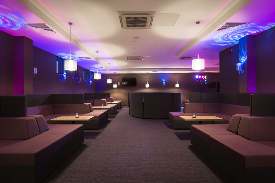 Gdzie integrować zespół? Na przykład w Blueberry Club, który znajduje się przy salach konferencyjnych na poziomie -1. Jest to klimatyczna przestrzeń, w której dominują odcienie brązów oraz oberżyny. Klubowe, wygodne sofy z podziałem na strefy, pozwalające na swobodne rozmowy, nastrojowe oświetlenie z możliwością dostosowywania efektów w zależności od charakteru spotkania, dobrze wyposażony w alkohole bar, a dla potrzebujących kofeiny – esencjonalna kawa. Dodajmy stanowisko VR, liczne ekrany, na których można zespołowo śledzić transmisję meczu lub oglądać materiał przygotowany specjalnie na event, konsole do gier, parkiet pośrodku lokalu i dobre nagłośnienie. W Blueberry Club jest 100 miejsc zasiadanych w lożach, podczas imprezy pomieścimy tu nawet 130 uczestników.