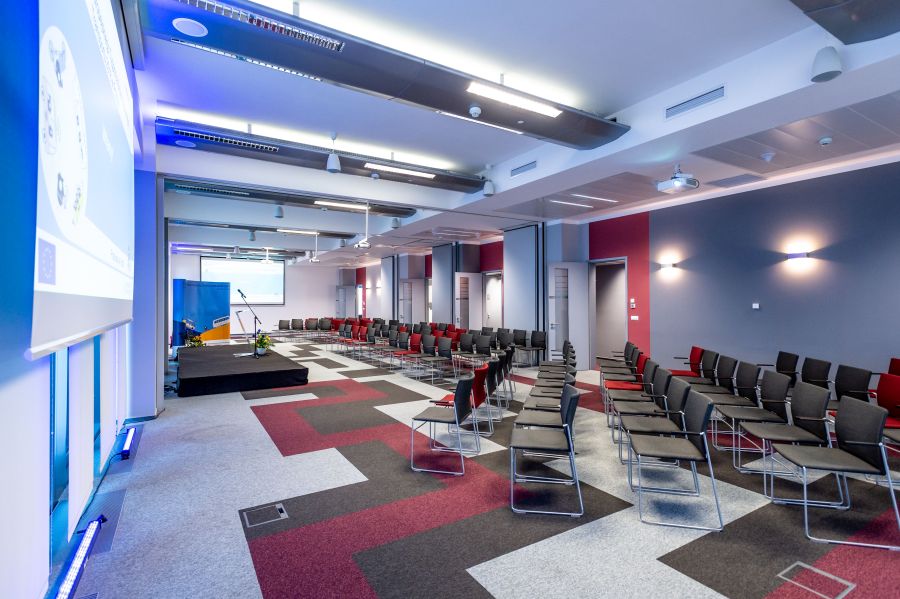 Oferta Centrum Konferencyjnego NIMBUS to łącznie 445 mkw. powierzchni. 7 sal konferencyjnych o zróżnicowanych gabarytach pozwala na optymalne dopasowanie pomieszczenia do potrzeb organizatorów i liczby uczestników wydarzenia. Przed wejściem do każdej z sal oraz w recepcji obiektu zainstalowany jest monitor, na którym można wyświetlać logo firmy, nazwę konferencji lub materiały promocyjne. W holu Centrum znajdują się również: dwie szatnie z pojemnymi szafami na odzież gości oraz sanitariaty. Kierując się w lewo, docieramy do sal: Nimbus I, II, III i IV, o powierzchni od 32 mkw. do 70 mkw. Mniejsze przestrzenie sprawdzą się na szkolenia dla 30–35 osób w układzie teatralnym, zaś największa – Nimbus IV – na 70 uczestników. Dzięki ściankom przesuwnym sale można dowolnie konfigurować, uzyskując finalnie przestrzeń dla nawet 220 osób.
