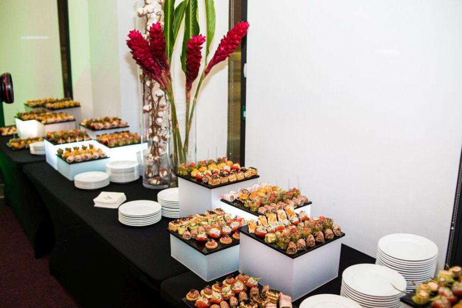 Centrum Konferencyjne NIMBUS zapewnia pełną obsługę cateringową. Smaczne i indywidualnie komponowane menu oparte jest na świeżych wypiekach i produktach pochodzących od lokalnych dostawców. Różnorodne przerwy kawowe, w tym popularna typu „fit”, oraz lunche w formie bufetu najczęściej organizowane są we foyer. Istnieje możliwość aranżacji bankietów przy ośmio- i dziesięcioosobowych stołach okrągłych. Jednym ze stosowanych w czasie bankietów rozwiązań jest np. organizacja bufetu wytrawnego w salach konferencyjnych, zaś słodkiego – we foyer. Nie ma możliwości korzystania z zewnętrznych usług cateringowych.