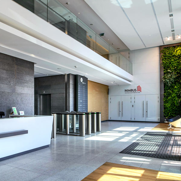 Piętnastopiętrowy biurowiec, w którym mieści się Centrum Konferencyjne NIMBUS, to przykład nowoczesnej architektury, z przeszklonymi ścianami, zapewniającymi wnętrzom dobre doświetlenie. Budynek klasy „A” został wykonany z materiałów przyjaznych środowisku i przy zastosowaniu energooszczędnych rozwiązań, co zaowocowało przyznaniem certyfikatu LEED. Na parterze budynku znajduje się całodobowa recepcja, zaś z jej prawej strony – dwa podwójne wejścia do Centrum Konferencyjnego NIMBUS. Sam obiekt posiada własną recepcję, czynną w godzinach pracy oraz podczas organizacji eventów i szkoleń. Przestrzenie CK NIMBUS są w pełni przystosowane do potrzeb osób niepełnosprawnych.