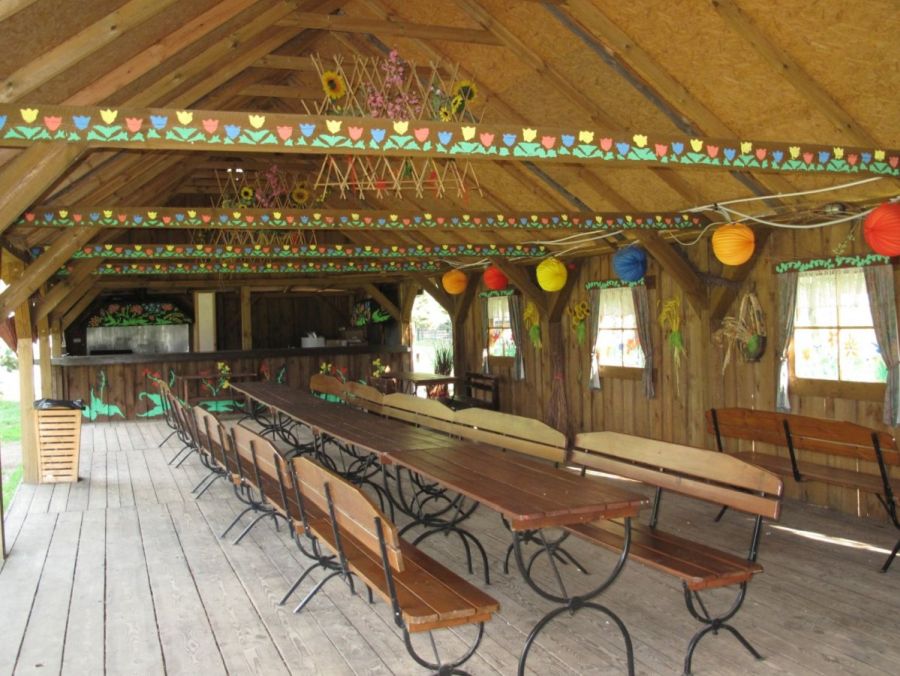 W cieplejsze miesiące z eventem na nawet 2000 uczestników można przenieść się na zewnątrz. Na terenie zielonym przy obiekcie (ok. 1 ha powierzchni) znajduje się zadaszona wiata, wydzielono także miejsca na ognisko i grill. Możliwe jest rozstawienie hal namiotowych (300 mkw. i 450 mkw.), a personel pomoże w zorganizowaniu oprawy scenicznej, technicznej, zabezpieczenia, jak również dodatkowych atrakcji sezonowych, np. kuligu.