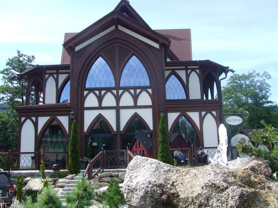 Zajrzyjmy do willi Rodven. Na parterze budynku znajduje się recepcja, a przestrzeń wokół niej zajmuje mała kawiarnia na około 30 miejsc. Jest to bogato zdobione pomieszczenie, w którym nietrudno dostrzec nawiązania do skandyndawskiej kultury. Wokół okrągłych, drewnianych stołów stoją krzesła przykryte białym suknem. Przez duże okna zakończone ostrołukiem rozpościera się widok na dolinę, ściany pokryte są beżową tapetą, a podłoga wyłożona jest płytkami w biało-czarną szachownicę. Lada recepcji aparthotelu jest bogato rzeźbiona, z podświetlonymi nazwami poszczególnych willi. Część konferencyjno-eventowa zajmuje parter oraz poziom -1.