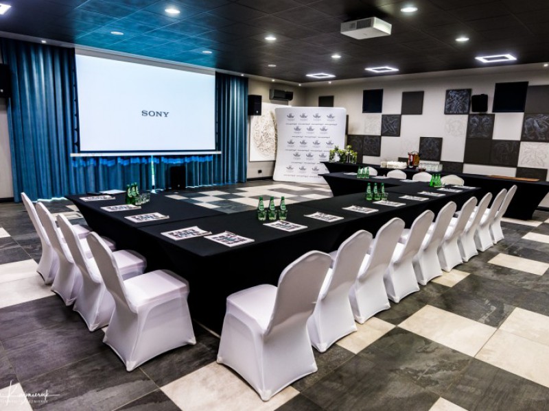 W willi Rodven, za recepcją, znajduje się sala konferencyjna o powierzchni 120 mkw. Sala jest klimatyzowana, z dostępem do światła dziennego i możliwością pełnego zaciemnienia dzięki grubym zasłonom wiszącym w oknach. Profesjonalne wyposażenie audio-wizualne – ekran, rzutnik, nagłośnienie sufitowe, zapewni odpowiednią oprawę konferencji. Wnętrze sali harmonizuje z pozostałymi przestrzeniami wspólnymi willi Rodven. Zarówno podłogę, jak i ściany pokrywają biało-czarne płytki, z umieszczonymi na nich dyskretnymi wzorami – skandynawskimi ornamentami. Dodatkową dekoracją są obrazy przedstawiające drakkary. Opuszczany elektrycznie ekran został zainstalowany nad ścianą z oknami zakończonymi ostrołukiem. Przy ścianie za uczestnikami szkoleń ustawiony jest mobilny barek, przy którym można zorganizować przerwy kawowe. Dużym atutem sali jest możliwość wyjścia na teren zielony wokół obiektu. Na ok. 40 mkw. została tu wydzielona strefa wypoczynkowa na około 20-25 osób. W ciepłe dni można tu przygotować grill. Przed wejściem do sali znajduje się szatnia. Druga z sal, tzw. VIP Room, to kameralna sala o powierzchni ok. 8 mkw., znajdująca się na poziomie -1, przy strefie rozrywki. To utrzymana w błękicie stylowa przestrzeń z boazerią i wzorzystą tapetą oraz karcianymi motywami na wykładzinie i podświetlanym suficie z żyrandolem. Choć VIP Room jest z dwóch stron przeszklony, zapewnia intymność podczas spotkania biznesowego. Do wyposażenia należą DVD, flipchart, rozkładany ekran, dzięki któremu wygodnie przeprowadzimy tu wideokonferencję. Do VIP Roomu dostaniemy się zarówno schodami, jak i windą. Do zaplecza konferencyjnego wliczona jest także sala restauracyjna Piąta Pora Roku (270 mkw.). W układzie kinowym pomieści się tu 230 osób. Sala wyposażona jest w klimatyzację, sprzęt audiowizualny, nagłośnienie. Podczas bankietu z tańcami można tu rozłożyć parkiet, ustawić scenę o powierzchni 3m x 4m.. Organizatorzy międzynarodowych konferencji mogą także – na życzenie – skorzystać z kabin do tłumaczenia symultanicznego.