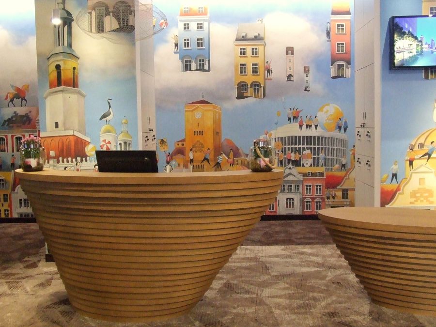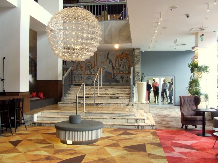 Business lounge to nie jedyna strefa przewidziana do pracy. W lobby hotelu, przy wysokich stołach, a także w części wypoczynkowej można popracować przy laptopie lub odbyć bardziej lub mniej formalne spotkanie biznesowe. Projekt lobby harmonizuje z wystrojem kawiarni i recepcji. Wszędzie na podłogach położona jest miękka wykładzina w geometryczne wzory, wystrój łączy różne faktury i barwy, jest dużo zieleni, poszczególne strefy są oświetlane przez wielkie, designerskie żyrandole, a hotelowy gość nie będzie miał trudności ze znalezieniem wygodnego fotelu do odpoczynku. Pod schodami prowadzącymi do foyer poziomu C, znajduje się kącik chill out, w którym mogą się też bawić dzieci, a na ścianach widnieją kolejne murale nawiązujące do miasta.