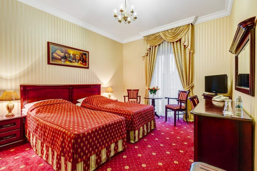 Staranność i konsekwencja w projektowaniu wnętrz widoczna jest też w części hotelowej Pałacyku Otrębusy. Na 1. piętrze obiektu mieści się 29 pokojów 1- i 2-osobowych oraz 3 apartamenty: Złoty, Perłowy i Rubinowy. Łącznie zakwaterować tu można prawie 70 gości. Wystrój pokojów łączy nowoczesne udogodnienia z klasyczną elegancją. Stylizowane meble, lustra, ozdobne żyrandole, wygodne fotele, udrapowane zasłony, obrazy na ścianach, tapety w delikatne wzory. W każdym pokoju goście korzystać mogą z indywidualnie sterowanej klimatyzacji, TV LCD (32”), biurka do pracy, telefonu, a w apartamentach: dużej łazienki z wanną, toaletki oraz łóżka typu „king size”.