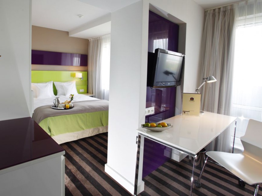 Przykładowy pokój typu Executive, o podwyższonym standardzie, prezentuje nowoczesne wzornictwo i kolorystykę. Klasyczna biel przełamana jest eleganckim fioletem i odcieniami zieleni oraz brązu. Wydzielona jest zarówno część przeznaczona do odpoczynku, jak i ta służąca do pracy. Do wyposażenia należą m.in. dwa TV LCD, indywidualnie sterowana klimatyzacja, sejf z gniazdem zasilającym, dostosowanym do laptopa.