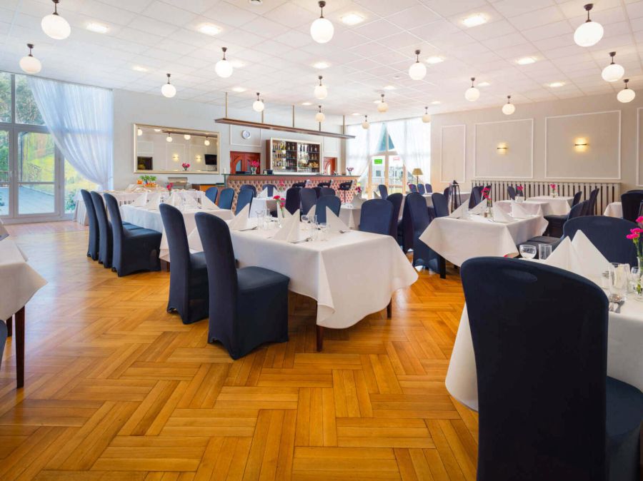 Goście ośrodka na smaczne śniadanie zaproszeni są do usytuowanej na parterze budynku restauracji. Podane im zostaną dania kuchni polskiej i międzynarodowej, jak dorsz w sosie cytrynowym lub Cordon Bleu. W ciągu dnia przestrzeń restauracyjna podzielona jest na wygodne, mniejsze strefy, natomiast podczas imprez firmowych czy konferencji wnętrze aranżowane jest zgodnie z potrzebami organizatora. Odnowiona sala prezentuje się bardzo dobrze: drewniany parkiet, meble utrzymane w beżowej i szarej tonacji, sztukateria, białe firany w oknach, dekoracje w postaci roślin i świeżych kwiatów, a z tyłu sali kominek, który dodaje uroku wnętrzu.