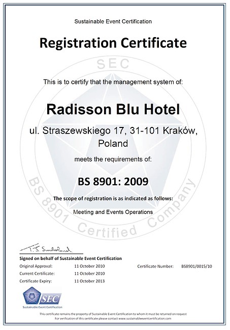 Certyfikat jest obecnie najbardziej wymagającą międzynarodową normą przyznawaną w dziedzinie zrównoważonego zarządzania imprezami. Sześcioosobowa kapituła konkursu „Liderzy Zrównoważonego Rozwoju” doceniła prospołeczne i proekologiczne aspekty tego osiągnięcia. Zwróciła także uwagę na świadome budowanie przez hotel własnej przewagi konkurencyjnej opartej na zintegrowaniu działań CSR ze strategią biznesową. W jaki sposób? Uzyskanie certyfikatu BS8901 pozwoliło Radisson Blu w Krakowie rozbudować swoją ofertę o pakiet Zielonych Spotkań.