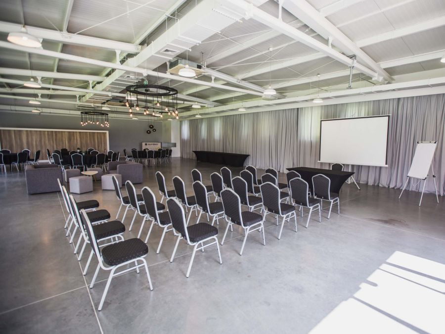 Ogromne okna z przeszkloną bramą dają możliwość wprowadzenia do środka samochodu. Jeśli planujesz imprezę o bardziej klubowym nastroju lub wyświetlenie prezentacji, okna te można zaciemnić szarymi zasłonami. A może wykorzystać piękną aurę i otoczenie? Wystarczy otworzyć bramę i część imprezy przenieść w plener. Pozornie surową industrialną przestrzeń za pomocą dekoracji, oświetlenia i dobrze dobranego umeblowania łatwo przemienić w elegancką salę bankietową, wygodne pomieszczenie treningowe czy miejsce na promocję produktu.