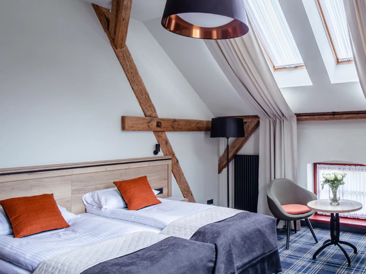 Wystrój zarówno pokoi, jak i części wspólnych nawiązuje do tradycji obiektu oraz pierwotnego przeznaczenia tej części kompleksu. Wyeksponowano drewnianą konstrukcję belek dachowych i ceglane ściany oraz zastosowano materiały o stonowanych barwach. Dopełnieniem projektu są proste, funkcjonalne drewniane meble z metalowym wykończeniem, ściany wyglądające jak bielone wapnem i wykładzina podłogowa w kratę. Dzięki nowej przestrzeni w Zamku Topacz będzie można zakwaterować ponad 130 osób.