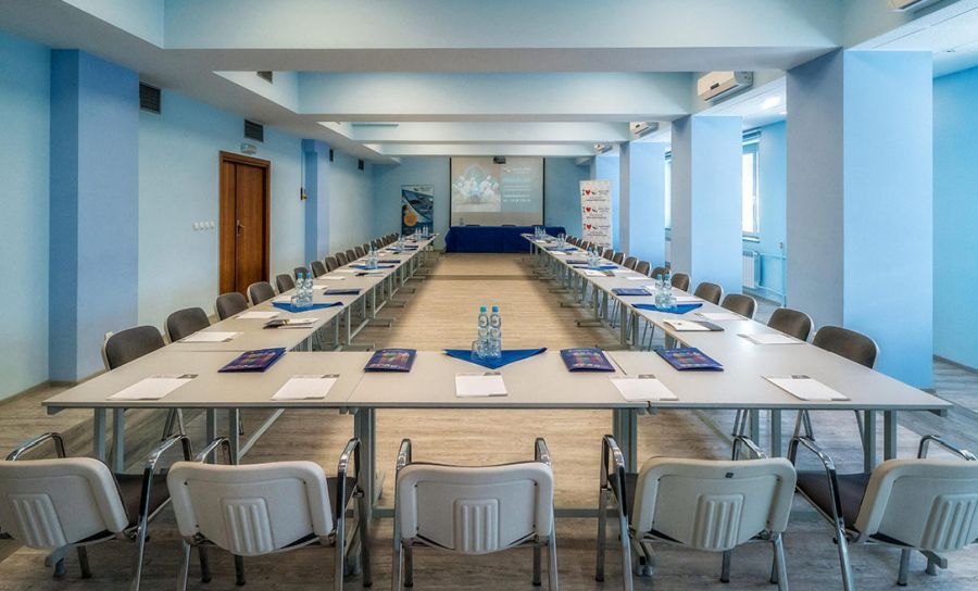 Zespół Pensjonatów Antałówka w swojej ofercie ma 3 sale konferencyjne, w których możesz przeprowadzić jednocześnie szkolenia dla 280 osób. Największa z nich, położona na parterze pensjonatu Antałówka I sala A, o powierzchni 144 mkw., pozwoli na zaaranżowanie konferencji na 150 uczestników w ustawieniu teatralnym. Sala urządzona jest w przyjemnych dla oka barwach. Ściany są błękitne, podłogę wyłożono drewnianymi panelami, na suficie zainstalowano ledowe plafony i oświetlenie punktowe. Jasne meble dobrze komponują się z kolorystyką sali. Kolumny z prawej strony nie utrudniają gościom śledzenia prezentacji wyświetlanej na ekranie. Sala jest profesjonalnie wyposażona. Organizatorzy spotkań biznesowych mogą skorzystać z projektora multimedialnego, wbudowanego nagłośnienia, klimatyzacji, TV, DVD, podestu scenicznego, mównicy i flipchartów. Przestrzeń ma dostęp do światła dziennego, z możliwością zaciemnienia dzięki roletom. Z tyłu sali można wydzielić miejsce na przerwę kawową.