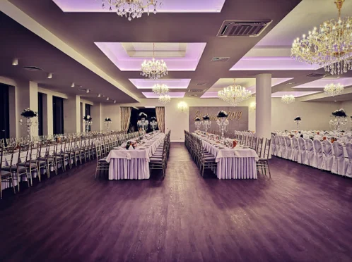 Dysponujemy największą w okolicy przestrzenią konferencyjno-bankietową, mogącą pomieścić do 500 osób. Posiadamy dwie nowoczesne, klimatyzowane, profesjonalnie nagłośnione i oświetlone sale bankietowe, z możliwością połączenia w jedną i organizacji imprezy do 500 osób lub 2 niezależnych w tym samym czasie, dla max. 250 osób. Każda z sal posiada osobne wejście, tarasy wypoczynkowe oraz parking.