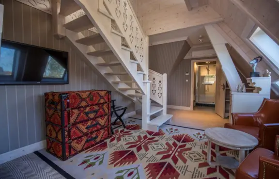 Architektura: Budynek po gruntownej i starannej renowacji, z podmurówką z kamienia, drewnianymi elementami okiennymi oraz spadzistym, ciemnoszarym dachem. Spektakularny efekt uzyskano dzięki połączeniu kilku stylów: zakopiańskiego, alpejskiego, awangardowych lat 20-tych i artystycznych lat 50-tych. Dzięki temu powstał obiekt na poziomie hoteli alpejskich.