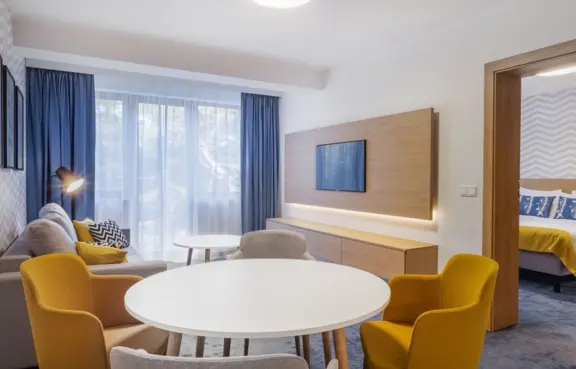 Każdy z pokoi wyposażony jest w telewizor LCD, biurko do pracy, krzesło, szafę, stojak na walizkę, szafki i lampki nocne. W każdym z pokoi znajduje się łazienka z prysznicem, umywalką, toaletą oraz suszarką do włosów. Dodatkowo, w pokojach znajdziecie Państwo żelazko z deską do prasowania, suszarkę na bieliznę, zestaw do parzenia kawy i herbaty, lodówkę oraz mini sejf, a w sezonie leżaki i parawany.