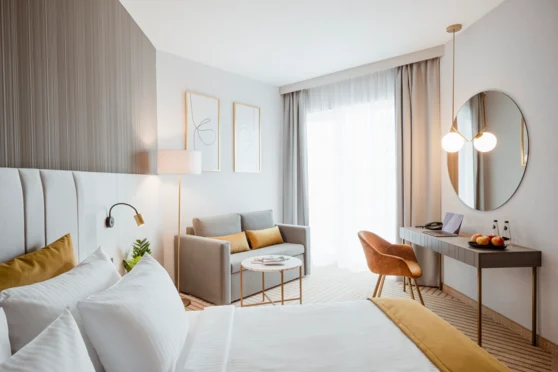 Pokój dwuosobowy z salonem i dwuosobową rozkładaną sofą, oddzielną sypialnią z dwoma jednoosobowymi łóżkami (90 x 200 cm) z możliwością złączenia oraz balkonami. Na wyposażeniu 45 metrowego pokoju znajduje też biurko/toaletka z lustrem oraz fotel.