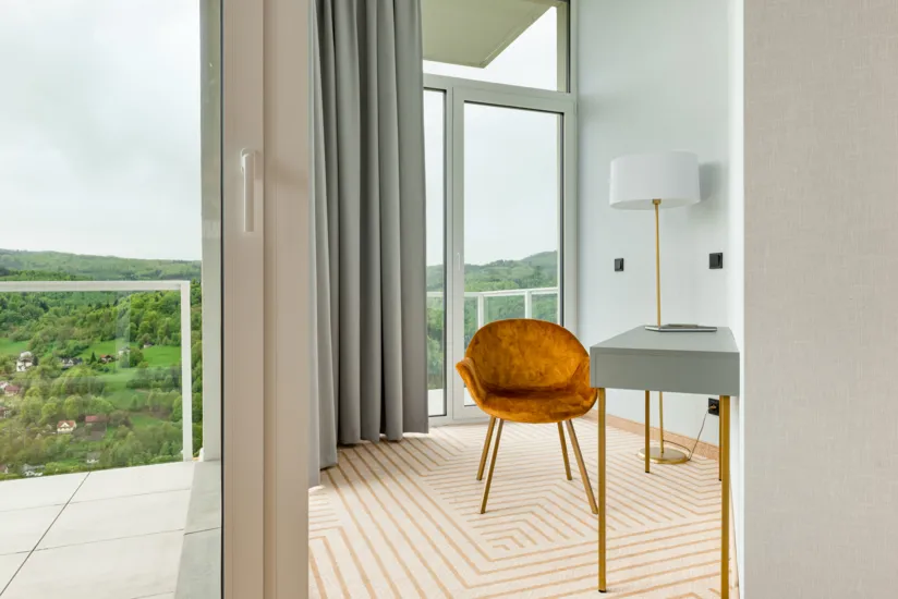 Pokój dwuosobowy z oddzielną niezamykaną sypialnią i salonem oraz balkonami. Jest to pokój z dwoma jednoosobowymi łóżkami (90x200 cm) z możliwością złączenia oraz dwuosobową rozkładaną sofą. Na wyposażeniu 35 metrowego pokoju znajduje się biurko/toaletka.