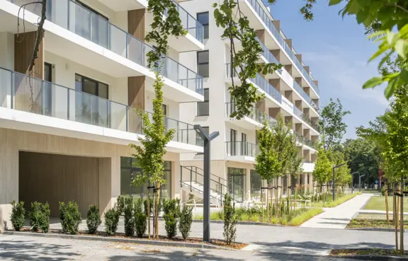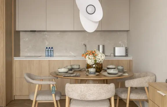 Architecture: A modern aparthotel complex with balconies. The architectural design combines elegance with functionality, reflecting the coastal character of the surroundings. Large windows and spacious balconies ensure abundant natural light and beautiful views.