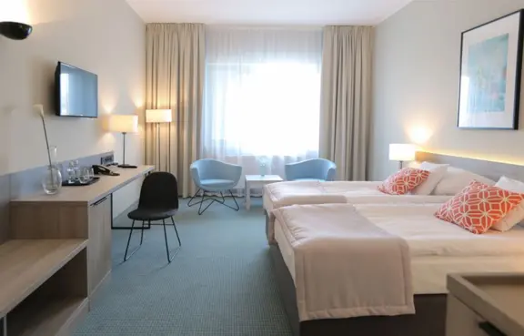 Pokoje: 20 pokoi. Łącznie Hotel FairPlayce Poznań udostępnia do 45 miejsc noclegowych.