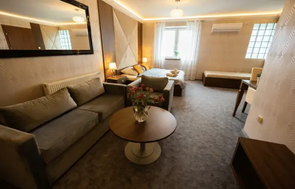 The offer includes an apartment with a large double bed, an additional single bed, a seating area, and a bathroom with a whirlpool tub – perfect for relaxation.