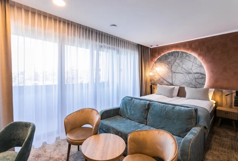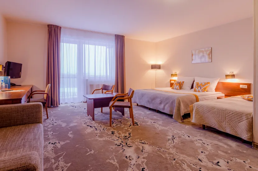 Jeszcze więcej miejsca dla dwóch osób - ok. 20-30 m2, podwójne łóżko (lub 2 pojedyncze). Pokoje dwuosobowe Grand Komfort w większości zlokalizowane są w GŁÓWNM BUDYNKU, natomiast 2 z nich znajdują się w budynku B na pierwszym piętrze bez windy. Wejście do