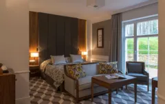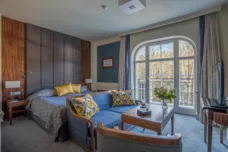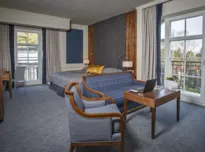 Pokój dwuosobowy z łożem małżeńskim o powierzchni około 37 m2, sofą, balkonem, łazienką z prysznicem i wanną. Wszystkie pokoje dla niepalących.