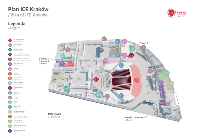 Meeting rooms: ICE Kraków has four main halls: Auditorium, Theater, Chamber Hall and Conference Hall Complex accommodating a maximum of 1,915, 594, 400 and 350 guests respectively. In addition, it offers multi-purpose rooms and dressing rooms, as well as a spacious foyer. The 3-level foyer can serve as both a representative public space for the center's guests, a banquet function, and an exhibition space with the possibility of arranging sponsorship and exhibition stands during conventions. The equipment of each room (lighting, sound system, multimedia) is included in the rental price. Each of the halls has built-in or mobile screens and projectors. Three halls are equipped with simultaneous interpretation booths.