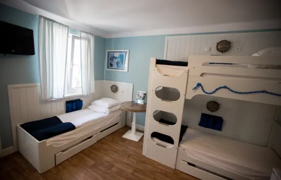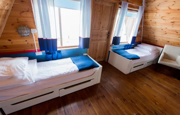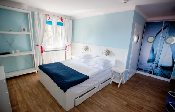 Obiekt oferuje 129 miejsc noclegowych w pokojach i apartamentach oraz domkach kapitańskich.
