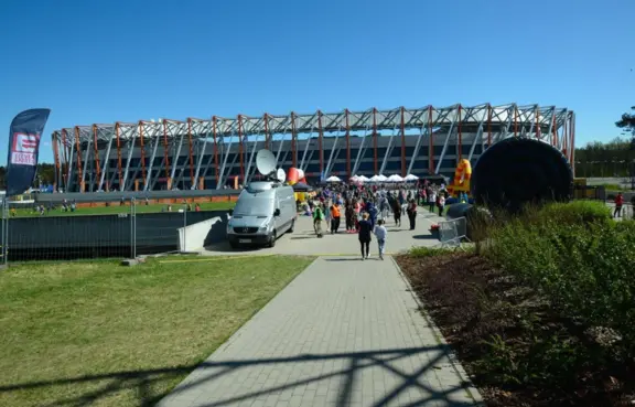 Nowoczesny obiekt z krytymi trybunami i pomarańczowo-białymi, metalowymi elementami podtrzymującymi.