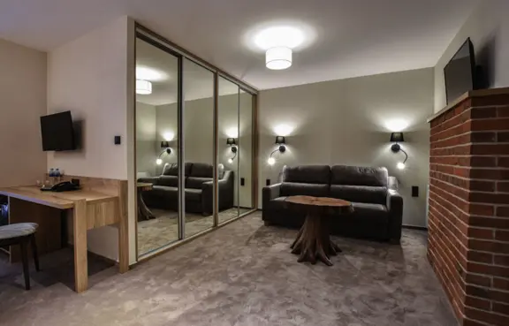 Pokoje: w obiekcie znajduje się 13 komfortowo urządzonych pokoi, w tym jeden dla osób z niepełnosprawnością. Łącznie udostępnionych zostało 26 miejsc noclegowych.