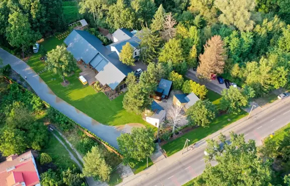 Architektura: wysoki, parterowy budynek ze spadzistym dachem, którego projekt łączy drewno i szkło. Obok szklarni znajduje się budynek główny z lobby.