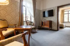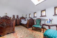 Pokój składający się z dwóch izb - w jednej łoże małżeńskie, w drugiej dwa łóżka jednoosobowe. Pokój ma ok. 40m2.